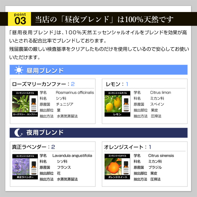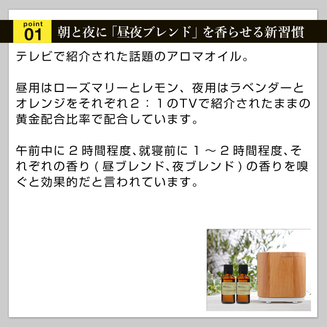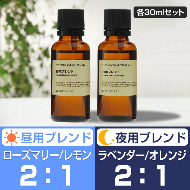 | 構成 | 【昼用ブレンド】 ローズマリー(2)、 レモン(1) 【夜用ブレンド】 ラベンダー(2)、オレンジスイート(1) |