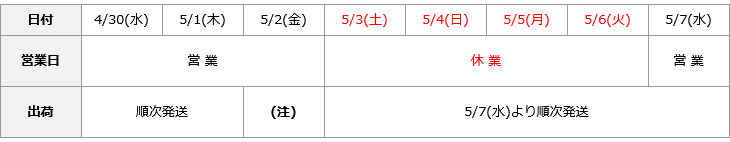4/29(水)、5/2(土)~5/6(水)は誠に勝手ながら休業とさせていただきます。