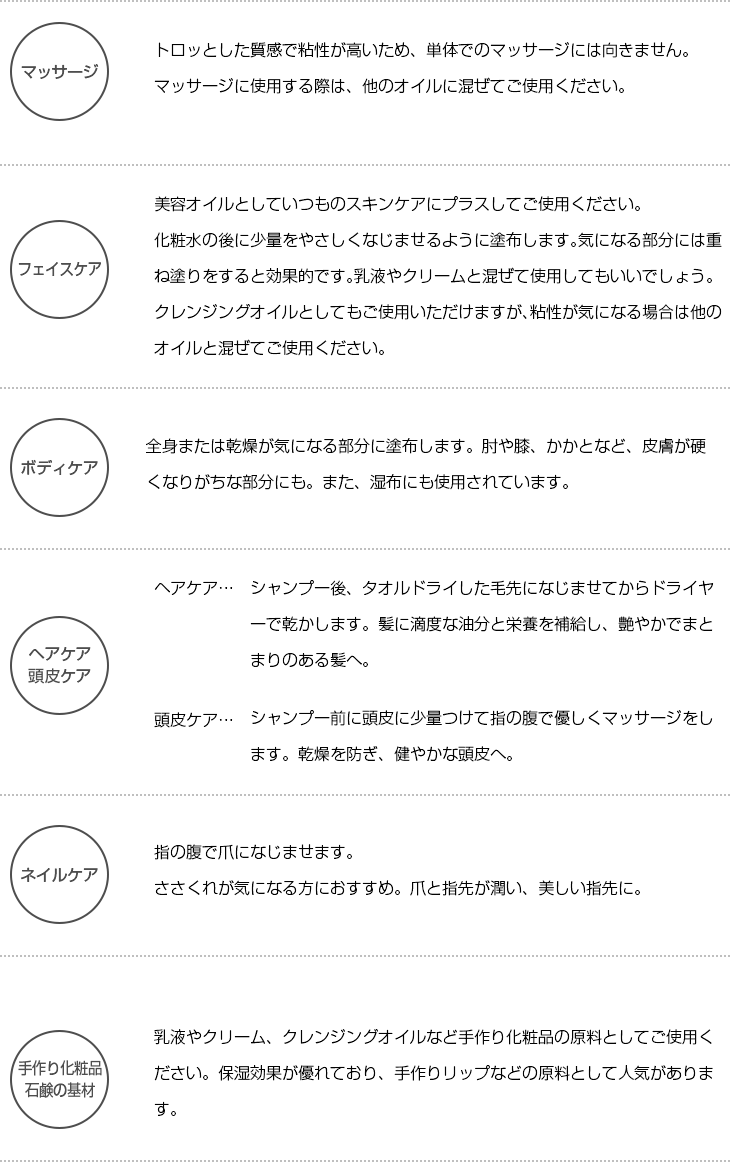 | 抽出方法 | 低温圧搾法 ※「低温圧搾法」とは、常温を維持しながら圧搾する抽出方法です。 |